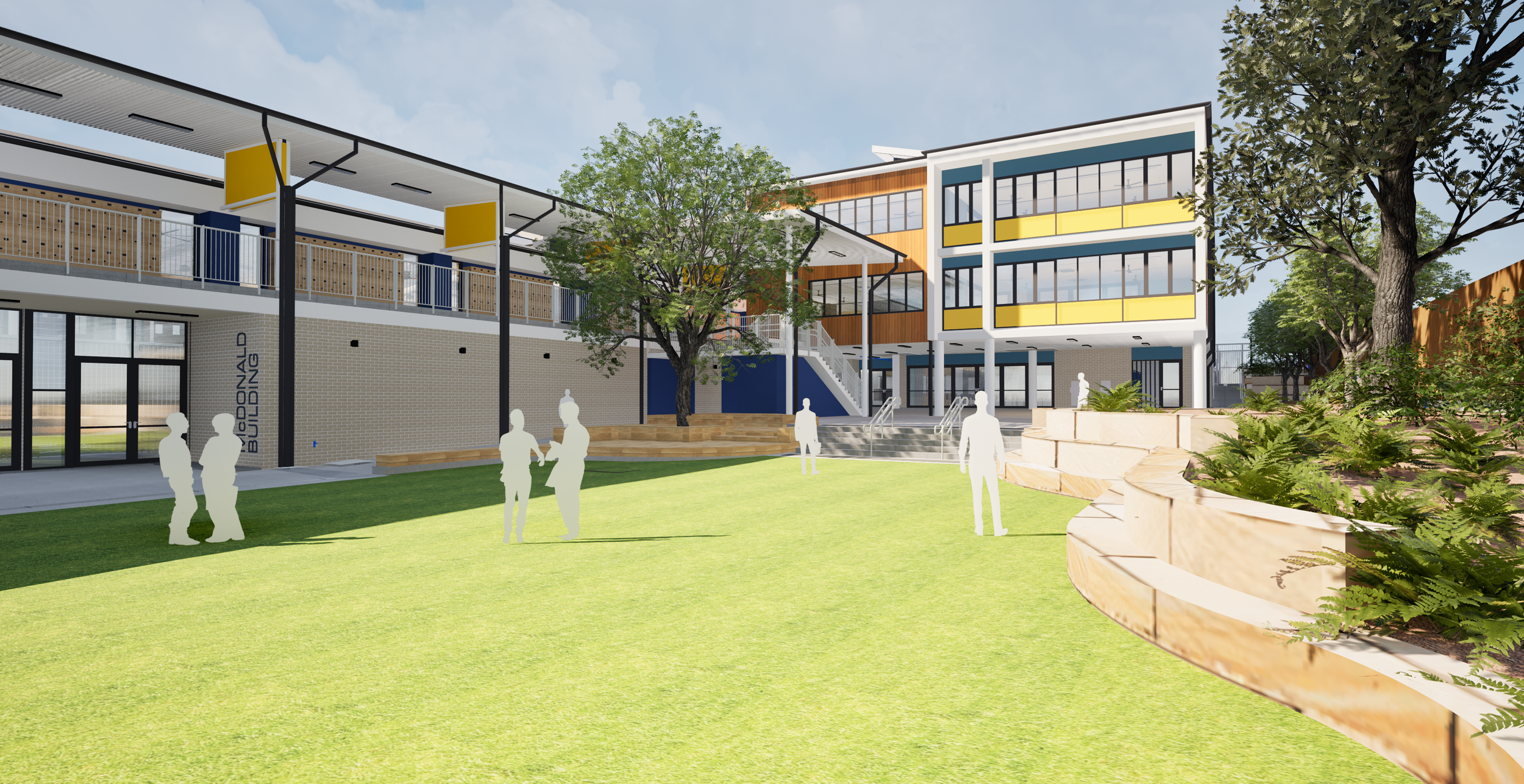 Stage One commencing next month involves construction of new two storey classroom building (Catherine Centre) housing 12 learning areas with associated learning support areas, staff areas, amenities and associated site works.